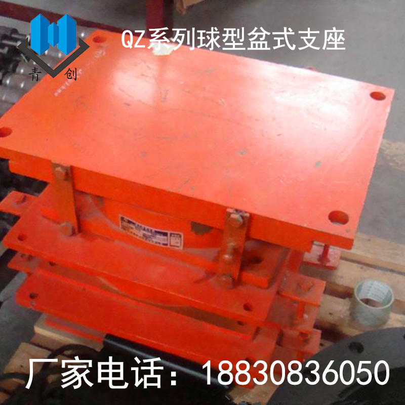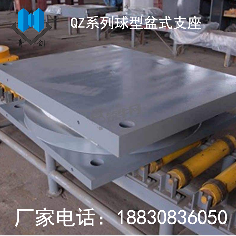 QZ橡膠支座主要由上支座板、下支座板、球形板、聚四氟乙烯滑板(即平面四氟板、球面四氟板)及橡膠擋圈組成一種盆式橡膠支座產品。它只是將盆式支座中的橡膠板改為球面四氟板;中間鋼板及底盆亦相應地改成球面,減小了摩擦系數。其位移由上支座板與平面四氟板之間的滑動來實現。在上支座板上設置導向槽或導向環來約束支座的單向或多向位移,可以制成球形單向活動支座和固定支座。通過球形板和球面四氟板之間的滑動來滿足支座轉角的需要。